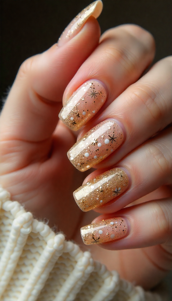 Gold snowflake nails feel festive, warm, and luxurious. A champagne or nude base with gold glitter creates a soft glow instead of overpowering shine.