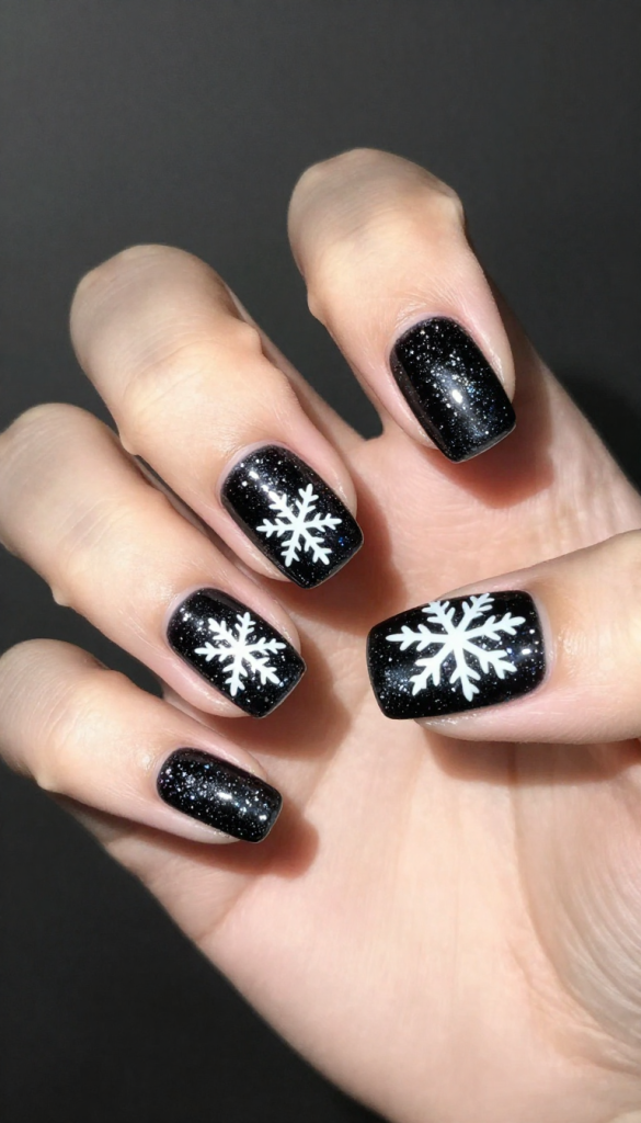 White snowflakes stand out sharply, giving a high-contrast winter design that feels modern and chic. A glossy top coat ties everything together.