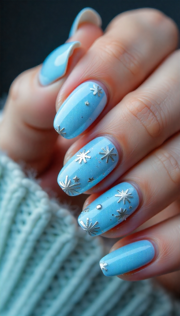 Tiny hand-painted snowflakes add detail without overpowering the nails. The shimmer reflects light beautifully, giving that “fresh snowfall” effect.