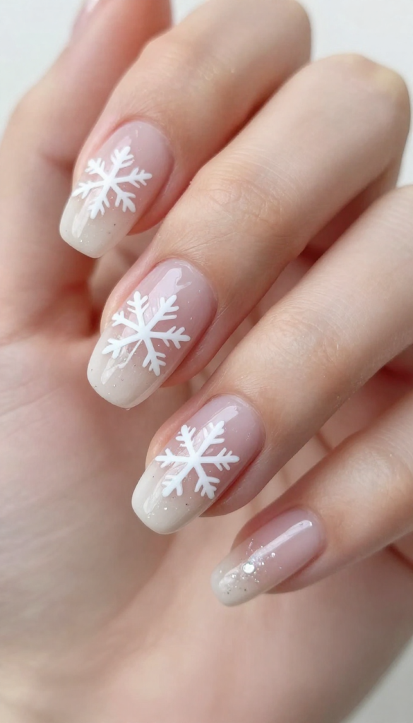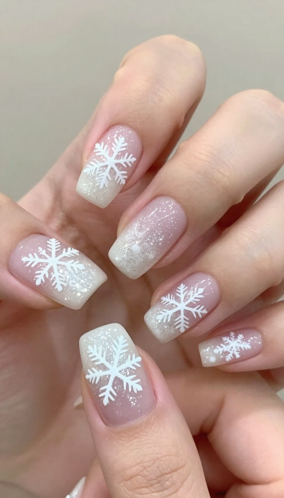 Soft pink snowflake nails are sweet, feminine, and surprisingly winter-appropriate. A blush or baby pink base with subtle glitter creates a delicate shimmer.