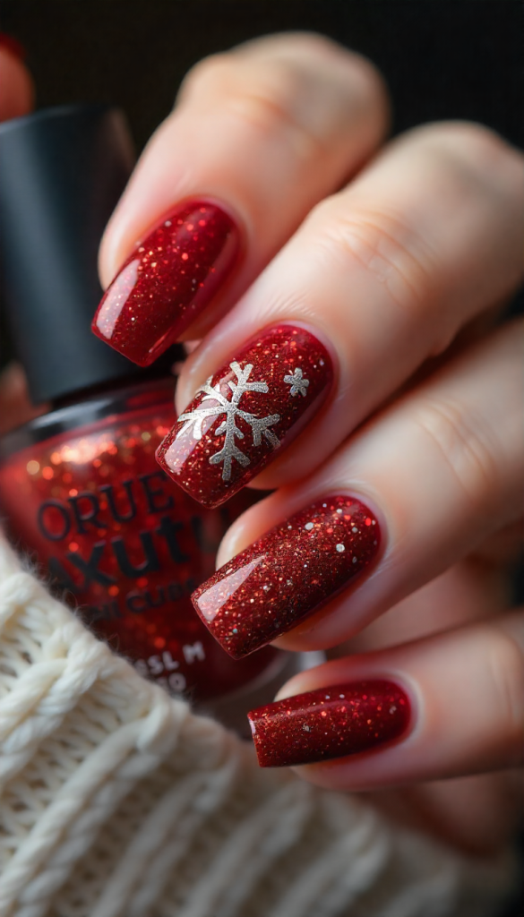 Red snowflake nails give strong festive and holiday vibes. A deep red base with gold or silver glitter creates a bold and glamorous look.