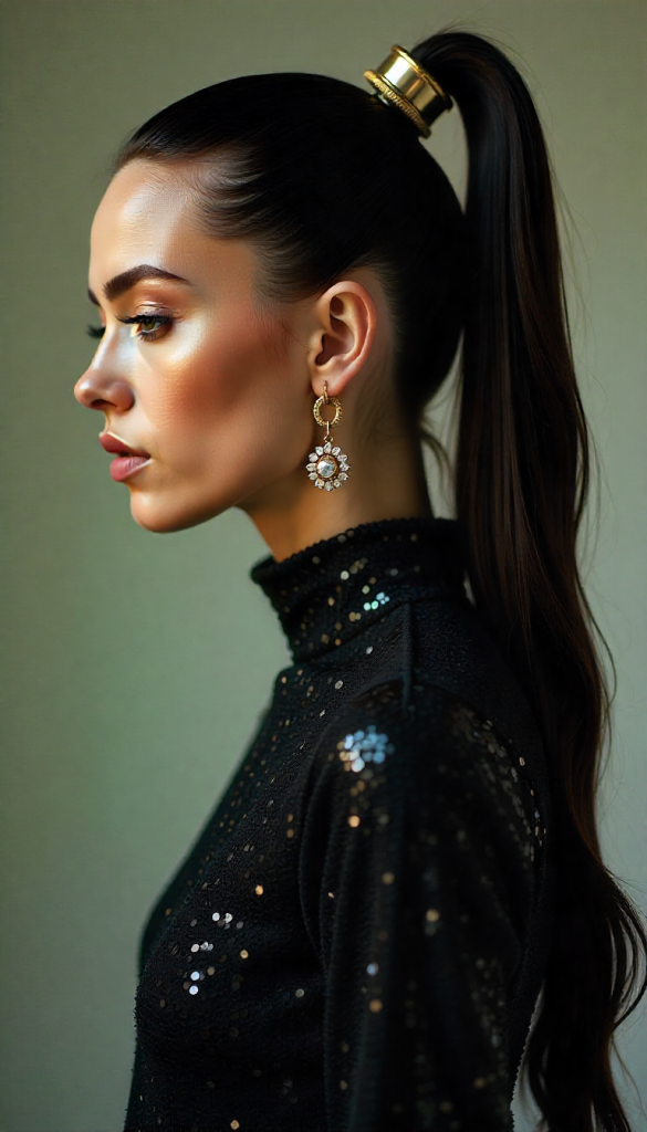 2. Sleek High Pony With Metallic Ribbon – A Modern Christmas Party Hairstyle
