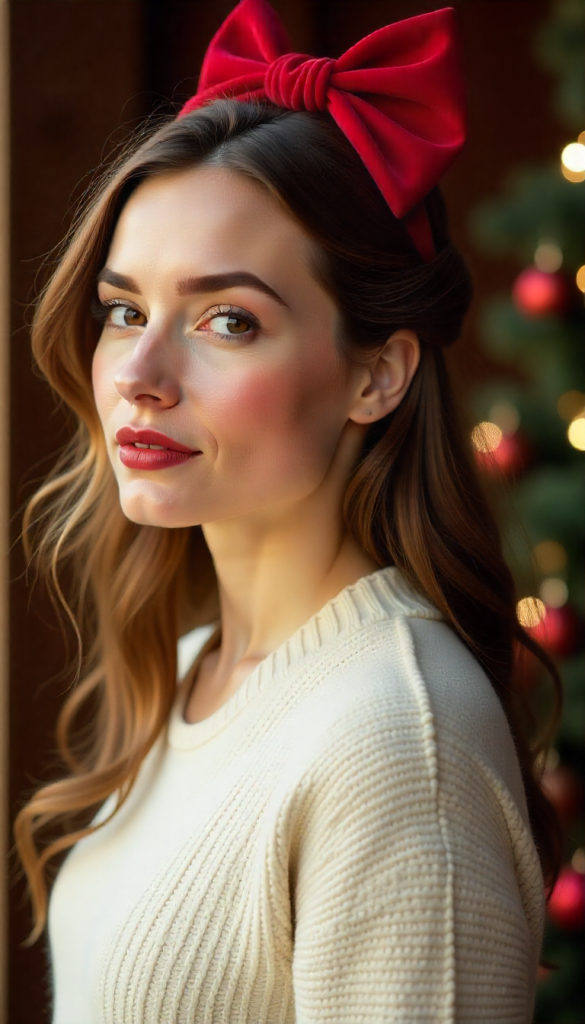 4. Half-Up Velvet Bow Hairstyle – Cute Christmas Party Hairstyle for All Hair Lengths