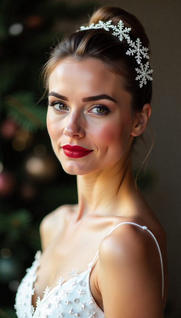 Nothing says “holiday glam” like a sleek high bun decorated with crystal snowflakes. The clean bun gives you instant elegance, elongates your neck, and creates the perfect canvas for your makeup to shine.