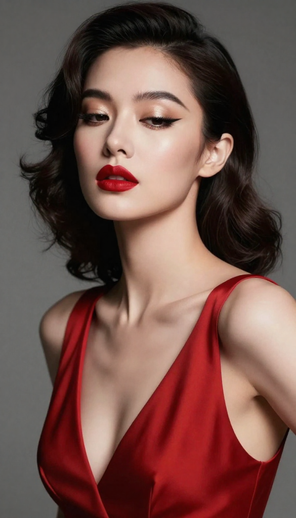 Soft neutral eyes in beige or champagne tones keep the focus on the lips, while subtle eyeliner and mascara define the eyes without overpowering the look. Skin should be flawless with a satin finish, gentle contouring, and a hint of peach blush.