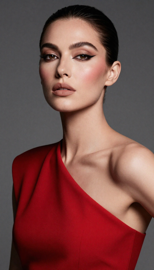 If you want your red dress to be the star, opt for nude makeup with sharp eye definition. Matte nude lips balance the boldness of red while winged eyeliner adds drama.