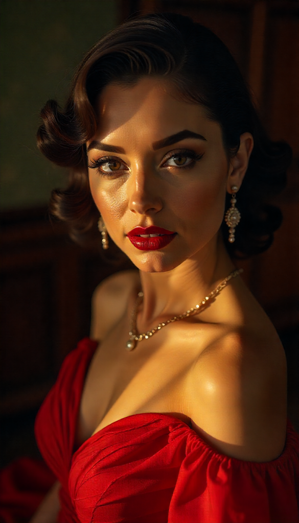 Think soft brown eyeshadow, precise eyeliner, voluminous lashes, contoured cheeks, and a classic red or deep berry lip. The overall effect is polished, feminine, and glamorous.