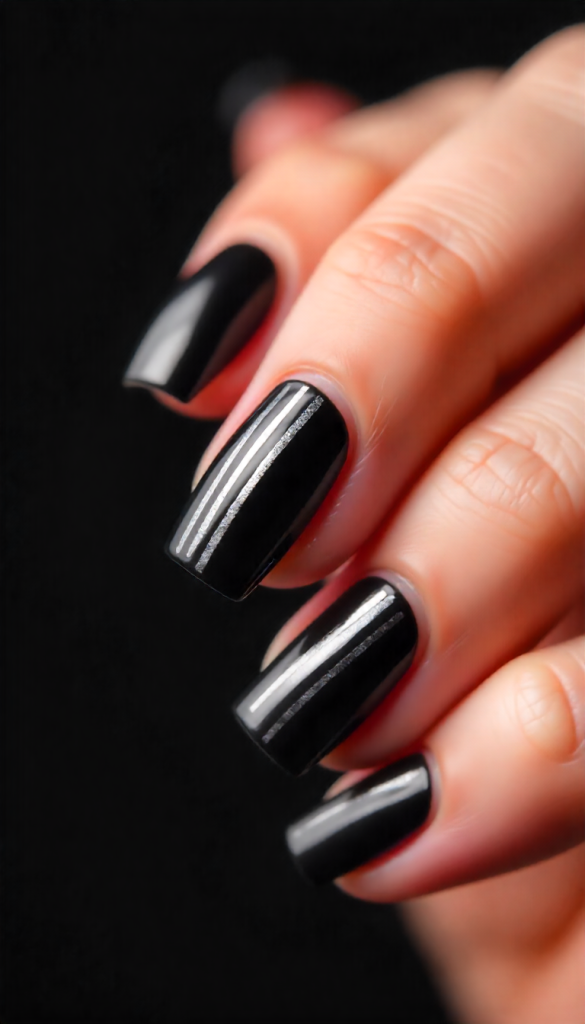 Black and silver striped nails combine modern geometric design with a glamorous touch. Nails are painted black and adorned with thin metallic silver stripes, either vertically, horizontally, or diagonally, creating sleek, minimalist patterns. Some designs may also include metallic accents on a single accent nail for a subtle but high-impact effect. This manicure works perfectly for fashion-forward individuals, giving a clean, sophisticated, and glamorous look that pairs effortlessly with edgy or formal attire.