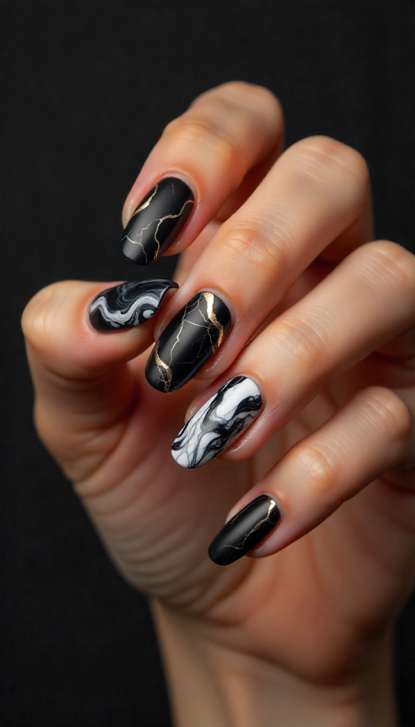 Black marble nails elevate classic black glam nails into an artistic masterpiece. A smooth black base is layered with white or gray marble streaks, creating a natural, stone-like texture. Fine gold veining is added to accentuate the marble pattern, bringing luxury and elegance to each nail. This design is perfect for special occasions, fashion events, or anyone who wants a unique and refined manicure. The combination of black, marble texture, and gold highlights creates an elegant, eye-catching look that is both bold and sophisticated.