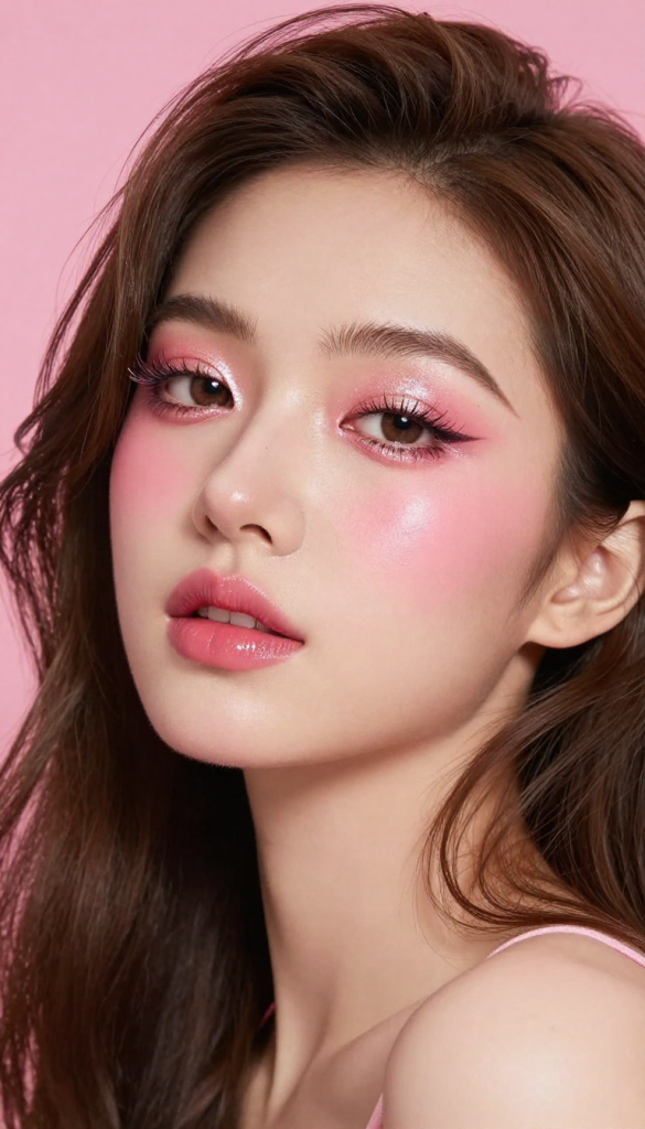 This look focuses on skin that glows like glass. Dewy makeup with subtle shimmer gives a fresh yet glamorous finish.