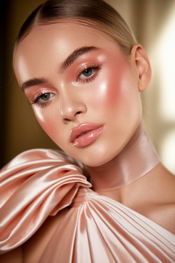 Lips stay understated with a satin pink-nude shade that ties everything together. This look feels modern, graceful, and ideal for women who love understated glamour with a sophisticated edge.