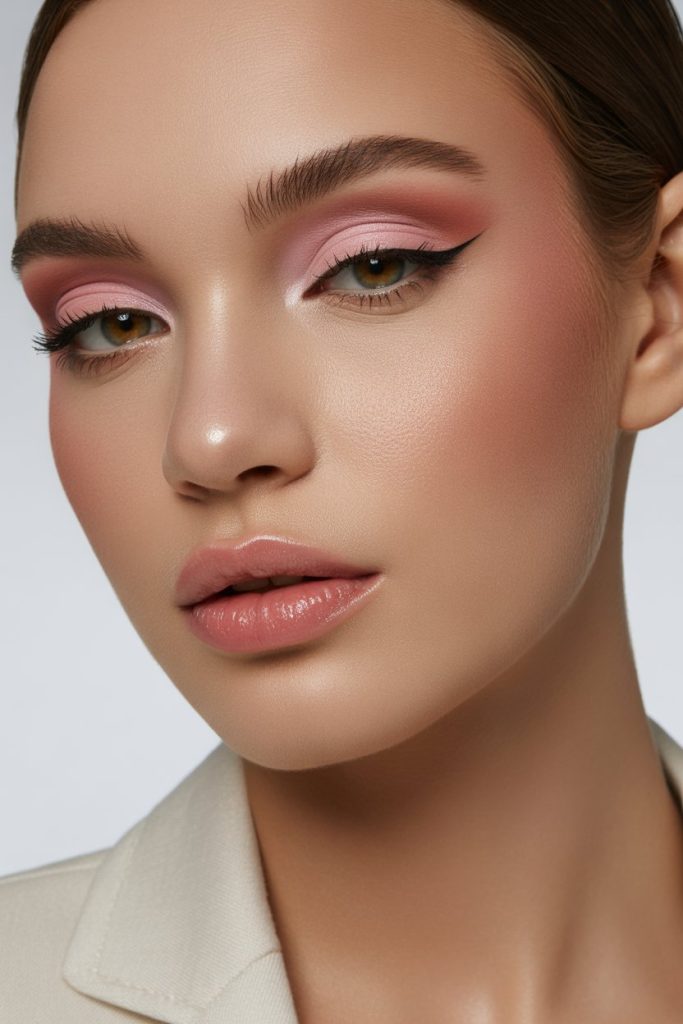 The eyes are dressed in muted matte pink shades, blended so smoothly that no harsh edges remain. Soft brown or pink-toned liner adds definition without breaking the softness, while wispy lashes enhance the eyes subtly.