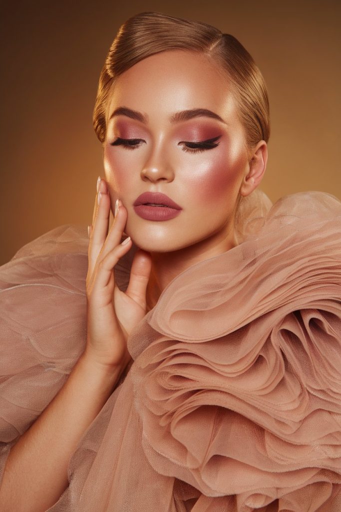 This look leans into muted, dusty rose shades that exude sophistication. The skin is luminous with soft highlighting on the high points, creating a goddess-like glow that feels refined rather than flashy.