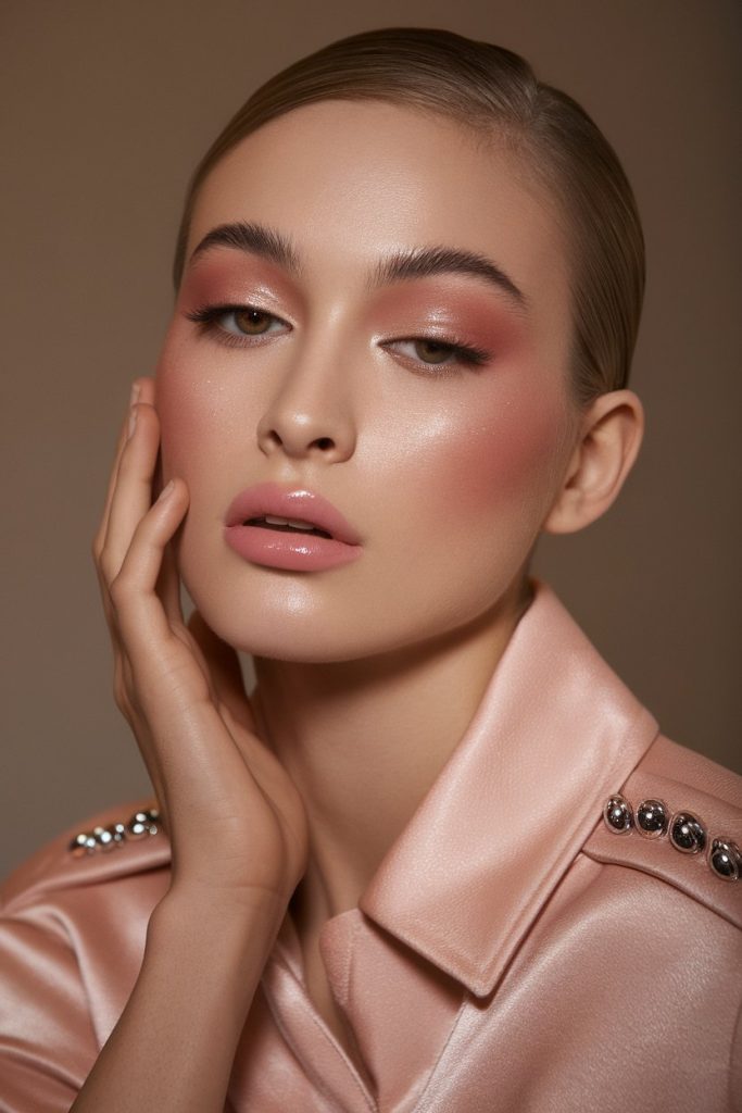 Eyes feature warm pink hues with a touch of delicate shimmer placed strategically on the lids. The shimmer is subtle, designed to catch the light rather than dominate the look. Cheeks are sculpted lightly with rosy blush and gentle contour.