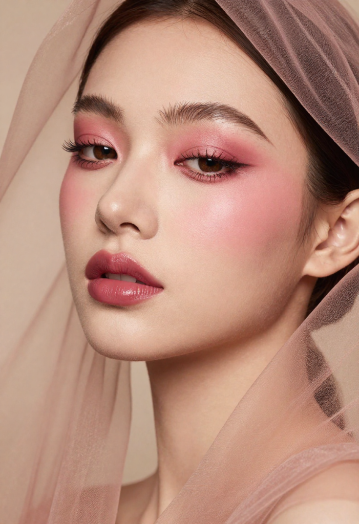 The eyes remain delicate and romantic, featuring pale pink or rose-toned shadows with a satin finish. Minimal eyeliner and fluttery lashes keep the look airy, allowing the skin to be the real star. The overall effect feels clean, elegant, and incredibly feminine.