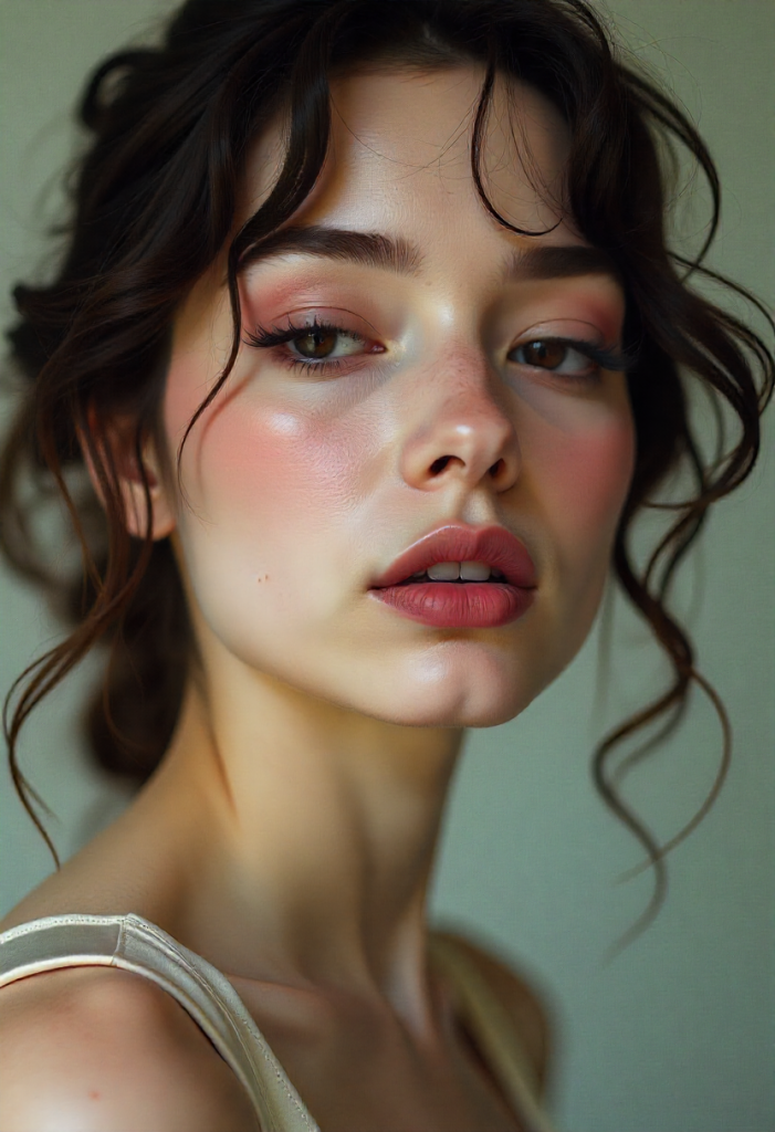 Eyes are kept barely-there, using sheer pink washes that enhance rather than transform. Blush is applied softly to mimic a natural flush, giving the face a youthful and radiant appearance.