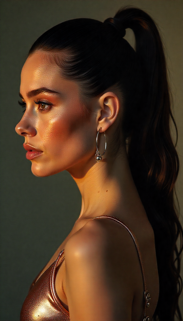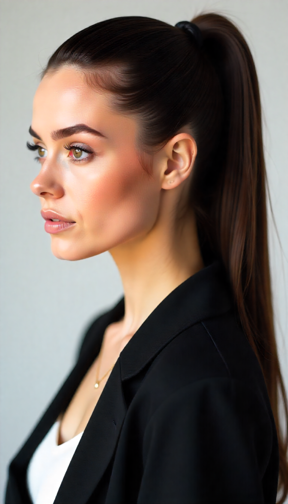 Pair this style with statement earrings or a bold lip color for an effortless, elegant look. Perfect for school, office, or a night out, the classic slick back ponytail suits every occasion.