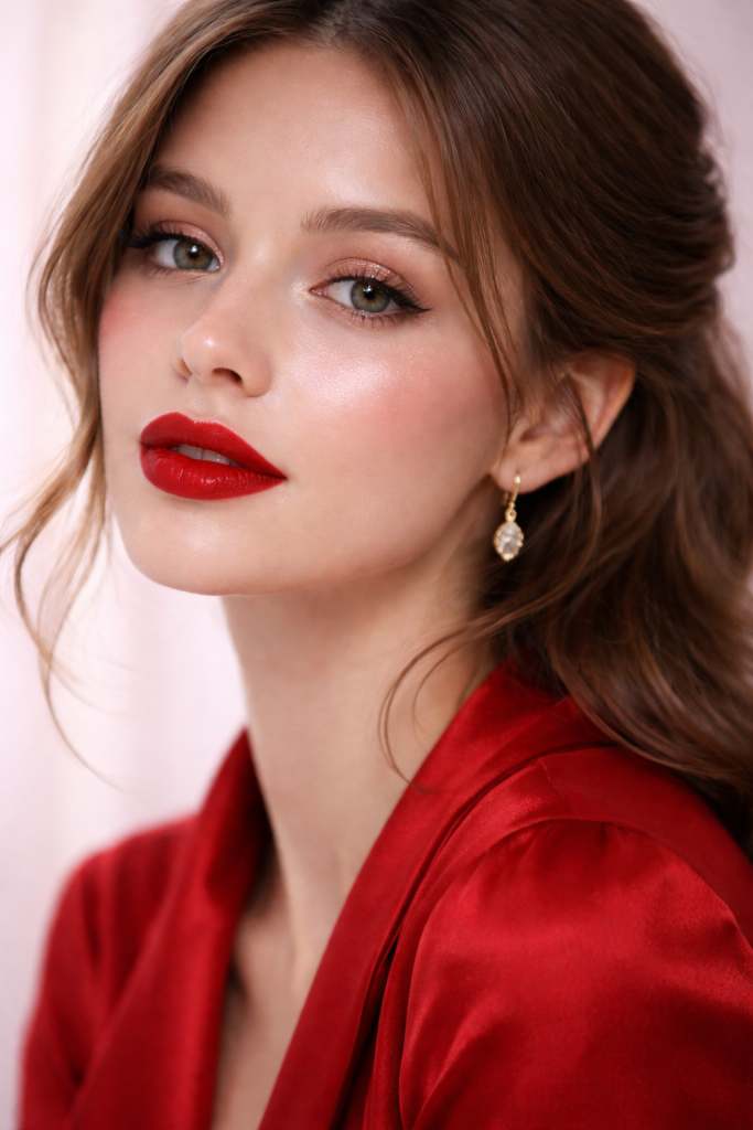 Nothing says Valentine quite like a red lip, and in 2026 it’s all about contrast. The focus is bold, perfectly defined red lips paired with clean, fresh skin and softly sculpted cheeks.