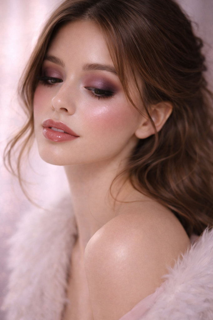 This look is pure Valentine magic. Soft pink blush melting into luminous skin, flushed cheeks, and a rosy glow that looks natural but dreamy. Think satin-finish skin, subtle shimmer on the eyes, and glossy pink lips that catch the light effortlessly.