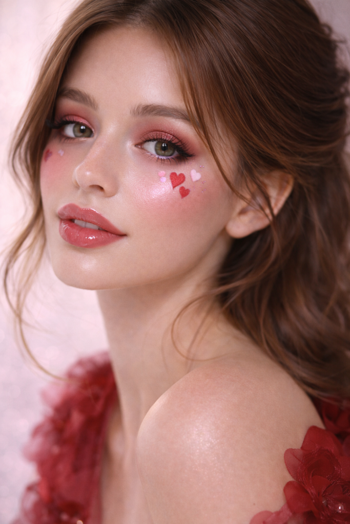 For those who love playful beauty, heart details are trending in 2026—but in a subtle, chic way. Tiny hearts near the eyes, soft pink graphic liners, or heart-shaped highlights add fun without looking costume-like.