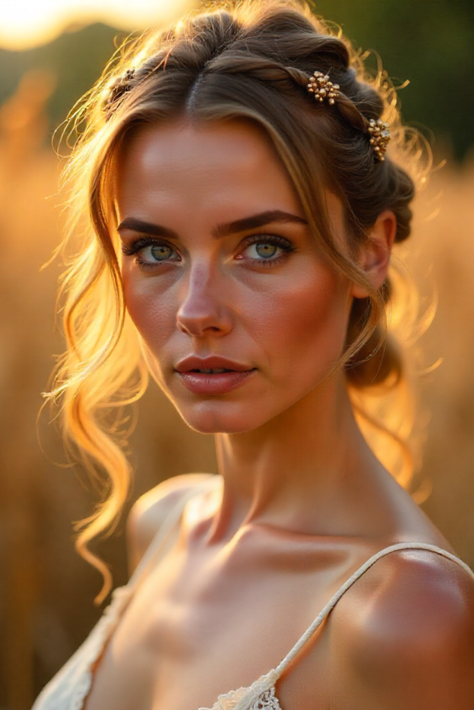Perfect for: Sunset or golden-hour weddings — the warm glow perfectly complements blue eyes in natural light.