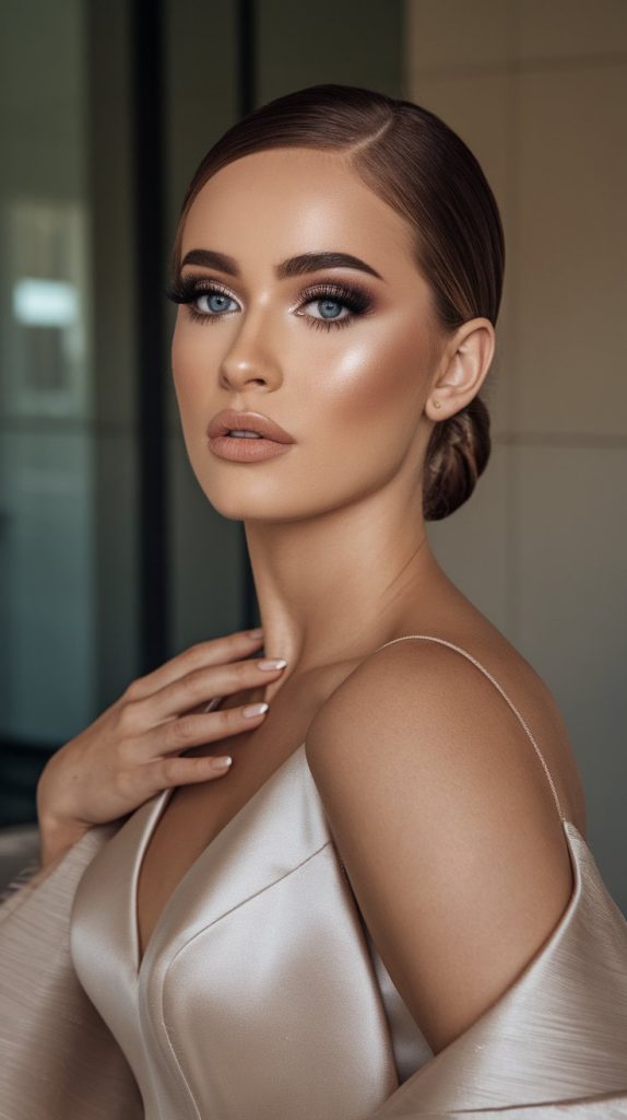 Add a touch of gold shimmer to the center of the lids for a glamorous, dimensional finish. Pair with sculpted cheeks, bold lashes, and a soft matte nude lip for balance.