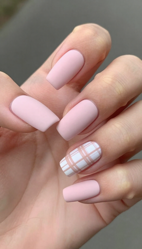 Try a matte baby pink or mauve base with subtle plaid detailing in white or beige.